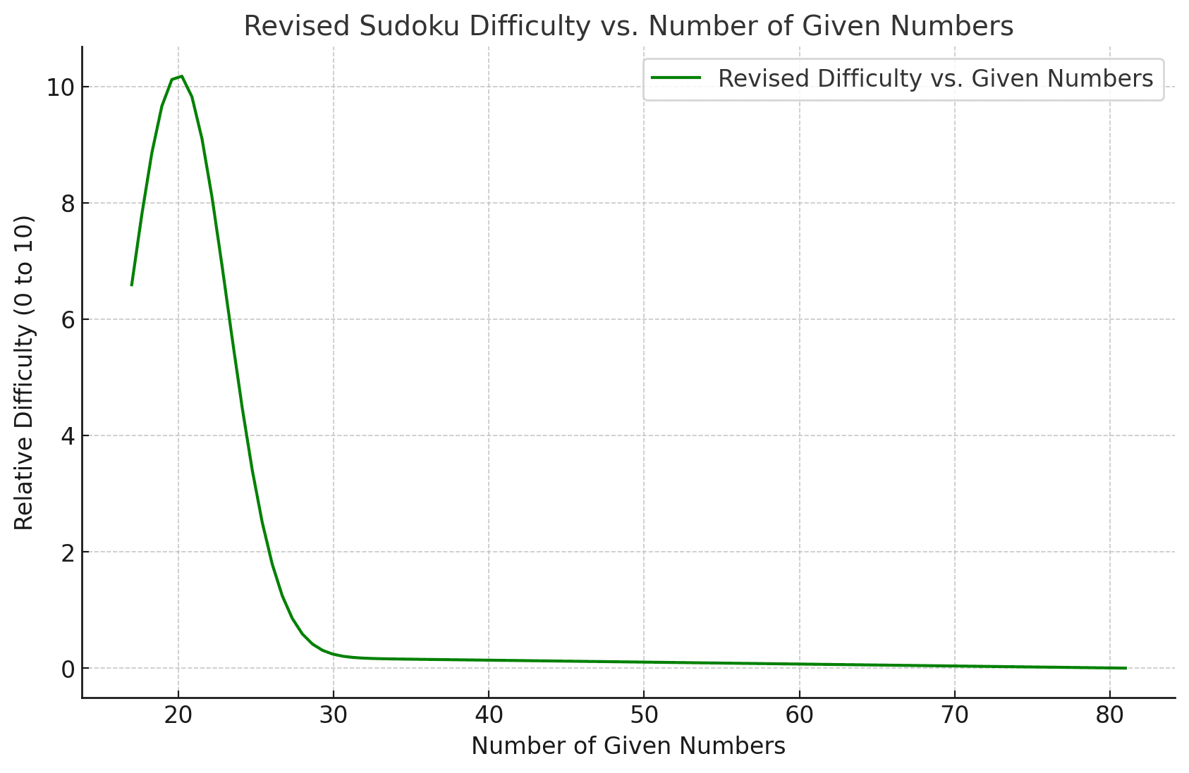 *Fun aside that I'm making sure I keep out of the scope of the article, but the mathematics behind Sudoku creation are *very* interesting. The curve that charts the difficulty of a sudoku puzzle for each number of 'initial numbers given' is not only non- linear, but shows a very narrow window for creating an engaging game. Sudoku puzzles can't really be made without around 17 given numbers, which is the theoretical minimum number of given numbers for a unique solution. All the difficulty in Sudoku exists between 17 and 30 given numbers, which is quite a narrow window. I've had a go at charting this below.